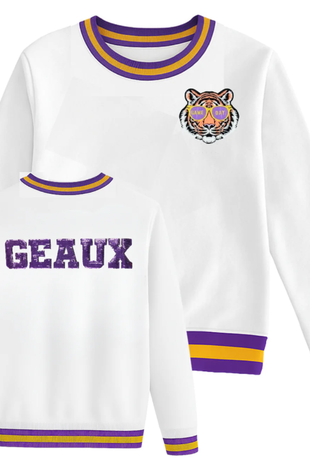 GEAUX Sequin Sweater with Sequin & embroidered TIGER on the front in LSU Colors! Embroidered Tiger and sequin details. A Louisiana Game Day essential. Absolutely gorgeous!