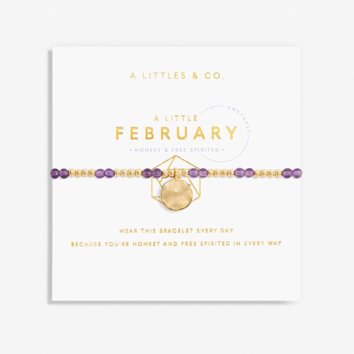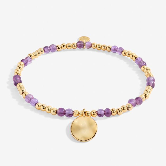 For all February babies, our lovely A Little Birthstone Bracelet radiates beauty with special semi-precious amethyst gemstones, stretch-bead design to fit every wrist, and a beautiful gold-tone plated charm.