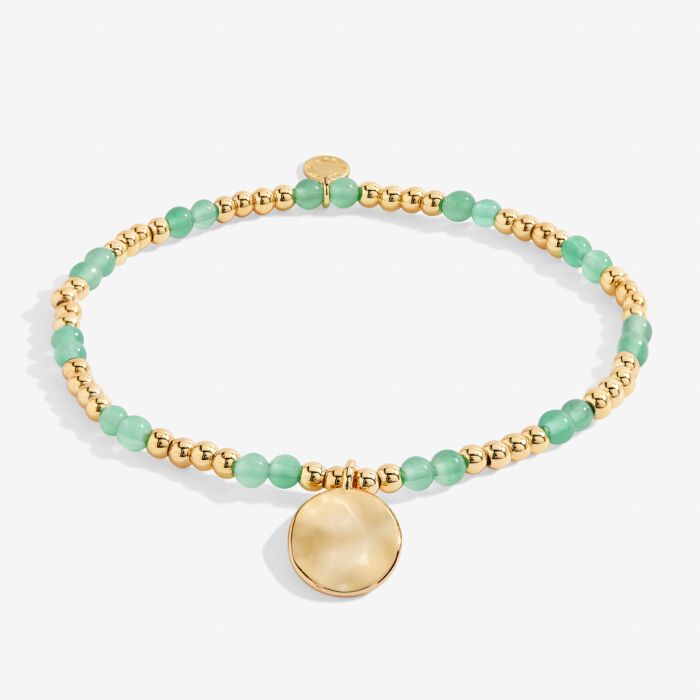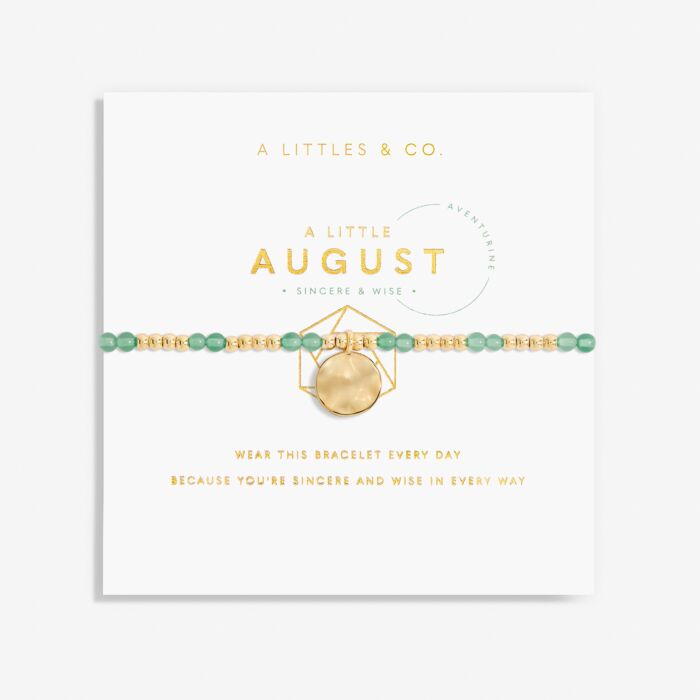 For all August babies, our lovely A Little Birthstone Bracelet radiates beauty with special semi-precious aventurine gemstones, stretch-bead design to fit every wrist, and a beautiful gold-tone plated charm.