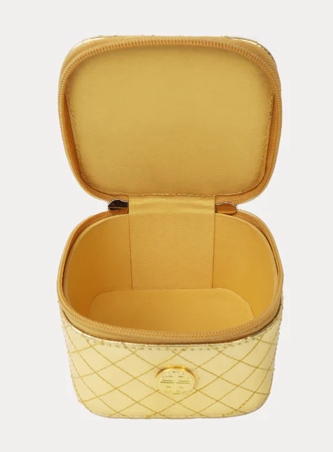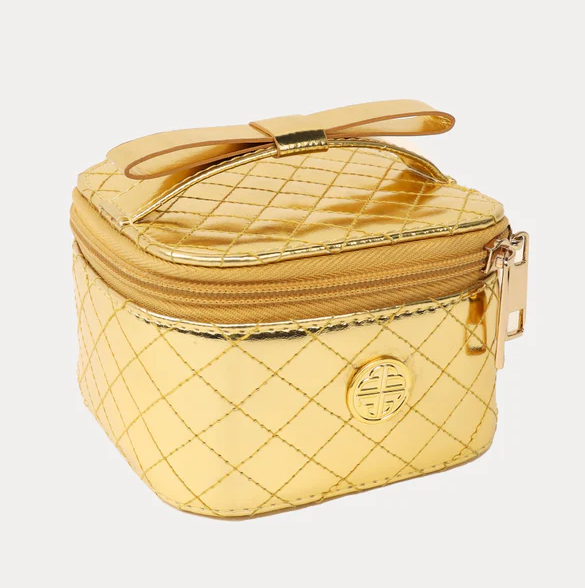 A petite quilted gold case with a whimsical bow handle, designed to carry your bangles and treasures in style wherever you go.