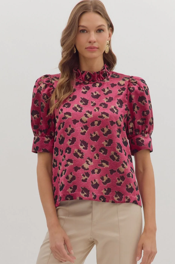 This vibrant animal print top features short puff sleeves and a ruffled mock neck that add a touch of drama to your look. Designed with a back button closure for an elegant finish, it’s lightweight, woven, and unlined for easy, breezy comfort. Perfect for pairing with tailored trousers or denim, this blouse brings a pop of personality to any outfit. Step into your style adventure with confidence and color.