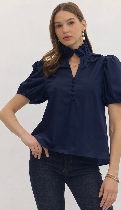 Solid short puff sleeve top featuring ruffled accent high neck with V-neck opening and button closure at front. Puff sleeve with elasticated opening. Gathered back yoke detail. Unlined. Woven. Non-sheer. Lightweight.