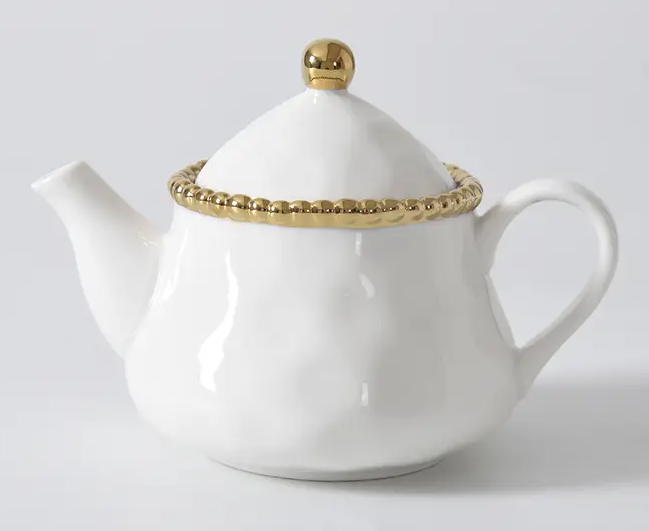 The combination of striking gold beads with high-fired porcelain creates the Tea Pot from our Golden Salerno Collection. Use for a fabulous brunch or delight guests by serving tea in this gorgeous tea pot! Diffuser Included. Food safe, dishwasher safe, oven safe to 500°. Tarnish and stain-free. Easy Care. Capacity: 16 oz