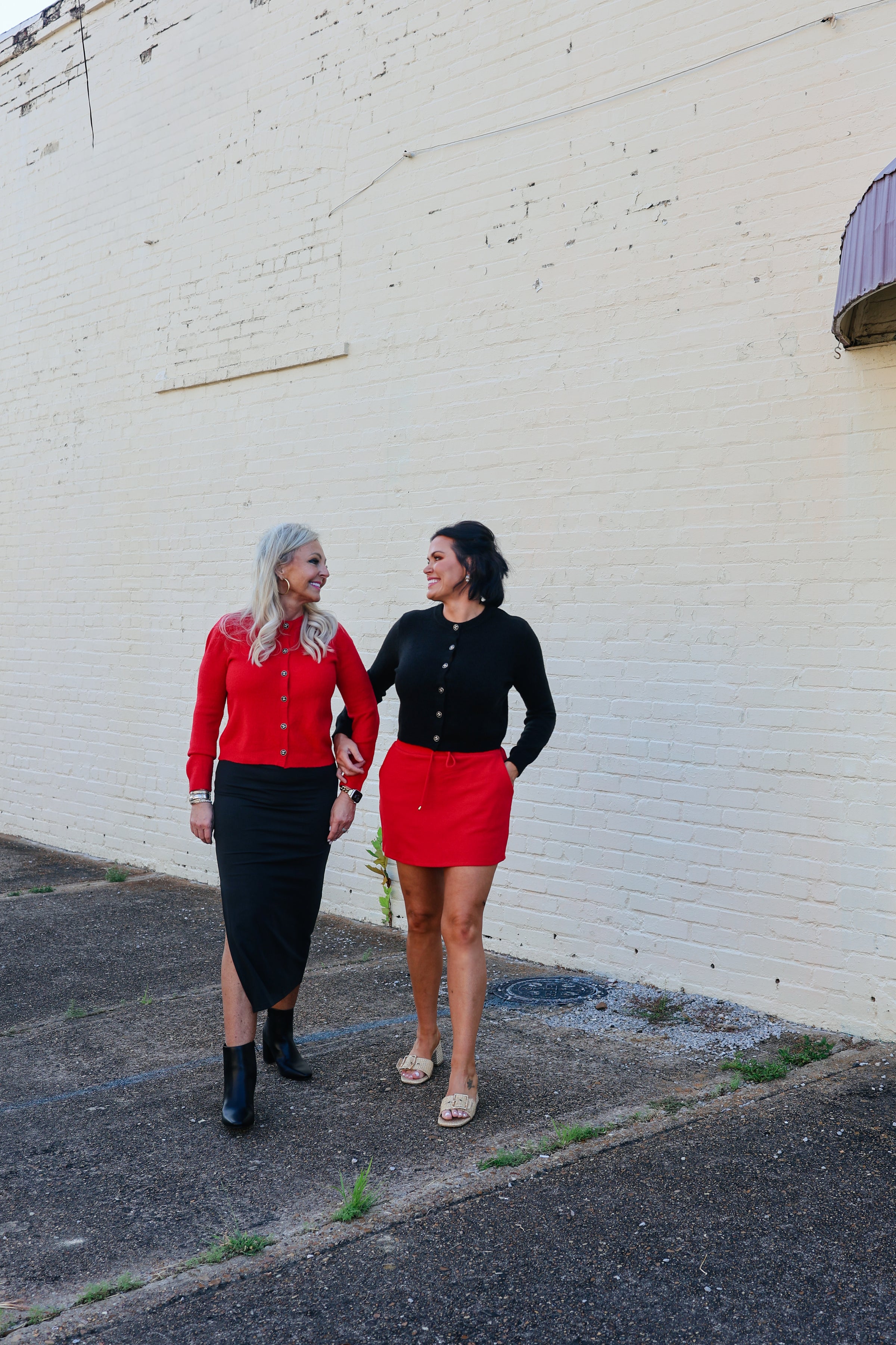 The Adri Sweater is available in red or black. This knit cardigan sweater has detailed bow buttons which sets it apart from just your ordinary top.