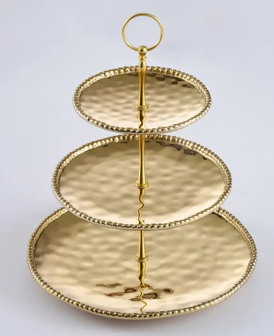 3-Tier Stand from our Monaco Collection. Beautifully showcase your desserts, pastries, or small sandwiches on this gorgeous multi-level display. The combination of high-fired porcelain and our revolutionary technology come together to create this striking gold tone with exceptional durability. Tarnish free and stain free, you won’t believe it’s NOT metal.